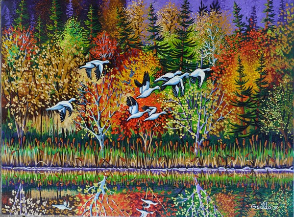 Biographie : «Guildo est un artiste-peintre autodidacte, natif de Val-Brillant de la Vallée de la Matapédia. Dès son enfance ses passe-temps favoris sont le dessin et la peinture, il remporte son premier concours de dessin à l'âge de 10 ans seulement. En 1975, il déménage à Québec afin de poursuivre des études en architecture. Animé par la création visuelle qui lui permet les voyages de l'esprit, c'est au début des années 80 après un court passage dans les Forces armées canadiennes, qu'il débute sa carrière d'artiste en tant que portraitiste pour une galerie d'Art, jumelé avec un emploi de technicien en fabrication artistique pour une boîte réputée de la vielle capitale «Poitra enseignes», où il explore la peinture à l'huile et y découvre un médium lui permettant une plus grande créativité et un jeu de lumière qui deviendra sa signature. Après quelques expositions collectives, il participe en 1991 à une vente à l'encan où sa toile atteint un prix phénoménal et lui offre ainsi un prix de participation. À son premier symposium, celui de Baie-Comeau qui accueille une trentaine d'artistes-peintres bien connus tels que, Umberto Bruni et Rémi Clark. En 1993 il obtient une invitation spéciale pour participer de nouveau au Symposium de Baie-Comeau et lui confère donc une reconnaissance de ses pairs. Premier grand récipiendaire de toutes les Bourses Gaby Drapeau en 1993, il remporte les prix du jury, du public ainsi que de la famille Drapeau. Il fait donc l'unanimité pour la qualité de son art et mérite, coup sur coup, lors du gala Arquimédia la même reconnaissance, soit ; artiste professionnel  de l'année, prix du Ministère de la Culture ainsi que celui du public. La reconnaissance de ses pairs est maintenant incontestable. Le début des années 1990 est donc très encourageant et plusieurs contacts sont établis. Laissant entrevoir un avenir prometteur pour l'artiste. Toutefois, le destin en aura décidé autrement. Des événements  familiaux se succèdent et Guildo fait le choix de s'occuper des siens au détriment d'une carrière florissante. Il consacre près de 15 ans à sa famille en prenant soin d'un père et d'un frère malade, décédé le premier en avril 2000 et le second en août 2012.  C'est en 2013 que Guildo ressort ses pinceaux pour de bon, il est complètement libre d'esprit et sa passion pour la peinture renaît. À 54 ans, il s'offre l'opportunité de partager son art et d'en faire son métier. Fortement inspiré par les scènes de rues ou de nature,  il déploie aussi son talent à travers une multitude de sujets autres, tels que le portrait, les animaux, têtes composées ou  tableaux surréalistes.  Ses œuvres deviennent accessibles par son approche novatrice. Il invite les gens à venir le voir à l’œuvre à l' extérieur ou en atelier.»