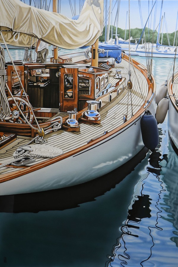 La traversée spatiale du premier plan au deuxième plan suggère une autre narration plus lointaine, mais seule celle du premier plan importe à LO qui vit le moment présent et qui ne cherche pas à voir plus loin dans le temps. On remarque d’ailleurs ce trait de caractère dans l’ensemble de sa peinture: le premier plan est toujours très détaillé pour ne pas dire « hyper » travaillé. Les ombres sont discrètes sur le pont et dans les drapés; c’est l’une des caractéristiques de l’artiste qui ne laisse rien au hasard. Les cordages ont leur part d’ombre et de lumière, les poulies vernies reflètent également cette surprenante lumière du jour. C’est le soin apporté aux plus petits détails qui nous fait comprendre que l’artiste passe beaucoup de temps sur chacune de ses toiles.»