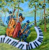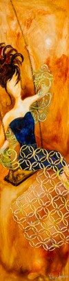Peindre la Joie de Vivre! C’est une recherche incessante où son inspiration se puise dans la vie quotidienne à travers ses sens. Elle utilise souvent la musique comme axe important pour donner du mouvement à ses œuvres. Coloriste, elle joue avec les couleurs fortes et vibrantes. Et quoi de mieux que l’emploi du verre de vitrail, matériau noble, pour donner encore plus de vie et de lumière aux petits moments de bonheur qu’elle peint. Son processus de création débute habituellement par de fines couches transparentes afin d’installer son sujet souvent sans esquisse au préalable. Puis, une alternance de fines applications de peintures émails pour le verre et de longs séchages culminent pour donner des œuvres aux couleurs très vibrantes. Peu importe ses thèmes choisis, ces derniers ne restent que des intermédiaires afin d’exprimer un moment joyeux. Laissez-vous vous imprégner dans son monde plein de joie de vivre!
