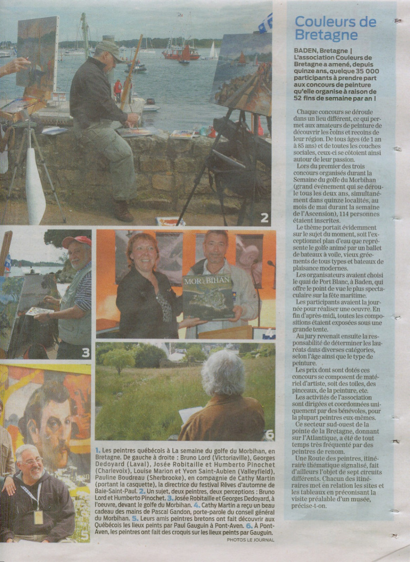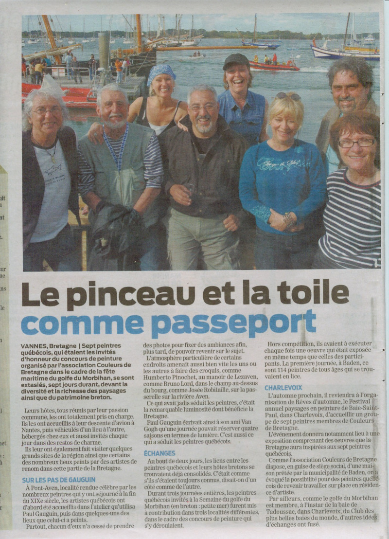 Ce reportage en couleurs de 4 pages nous informe sur l'échange culturel extraordinaire qui s'est établit entre «Couleurs de Bretagne» qui depuis 15 ans a accueilli plus de 35 000 artistes et Rêves d'automne, notre festival de peinture de Charlevoix qui sera tenu du 25 septembre au 4 octobre 2009. Humberto Pinochet, maître-académicien AIBAQ 2009, faisait parti d'un groupe de 7 peintres québécois pour cet échange