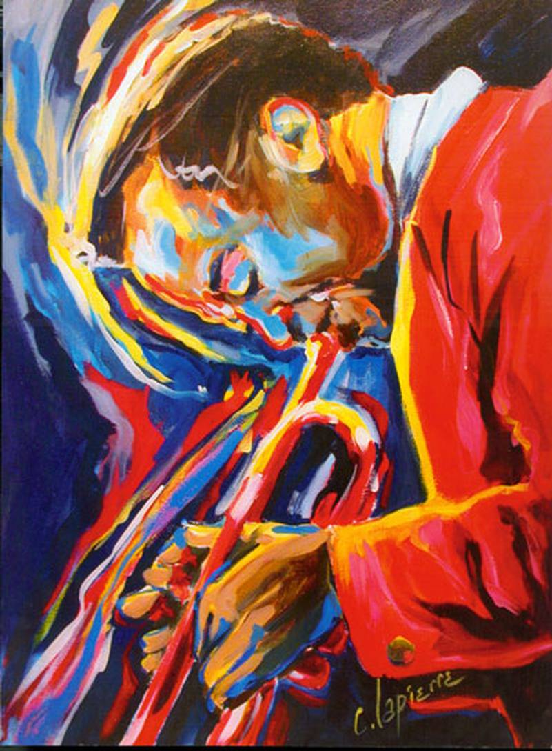 Miles Davis, le Picasso du Jazz, par Claude LapierreClaude Lapierre est né à Paris le 19 janvier 1942 et décédé à Montréal, le 19 août 2009. Après des études en dessin publicitaire, il s'installe à Montréal, en 1967, et poursuit sa formation aux Arts Graphiques de Montréal et à la Famous Artist School du Connecticut. En 1969, il entre au service de Radio-Québec, à titre d'illustrateur et de concepteur visuel. Il préconise avant tout l'aquarelle pour ses maquettes, ses illustrations, scénario-maquettes et caricatures, dont certains de ces travaux ont fait l'objet d'expositions. Il développe un intéret particulier pour les conceptions fantaisistes et les projets destinés à la jeunesse. À titre de directeur artistique, ses réalisations ont été mises en nomination à quatre reprises aux prix Gémeaux. Il côtoie l'édition en illustrant plusieurs volumes destinés aux enfants. Claude a exposé parallèlement, ses aquarelles et acryliques dans plusieurs galeries, et a participé à diverses expositions solo et de groupe. Ses thèmes favoris sont la musique, le sport, les portraits et les personnages. Soucieux d'une expression vivante à travers le geste, la couleur et la lumière, son travail reflète une observation qui se traduit dans un style impressionniste pour le dessin et expressionniste pour la couleur. Mon parcours de peintre, aujourd'hui, se situe entre l'image arrêtée de l'observation, de l'image rythmée, du mouvement précipité, d'une gestuellle rapide, une décomposition du geste et de l'éclatement de la couleur. Les mouvements saccadés de musiciens, le scintillement des cuivres, l'effort et l'élan d'un athlète, m'impressionne. Ce que je tente de traduire sur la toile, c'est de rendre la peinture sonore et mobile, comme les sujets. Ayant fait dans le passé beaucoup de dessin académique et d'observation, j'aime encore planter mon chevalet dans les champs et reproduire ce que j'y vois... tel quel!
