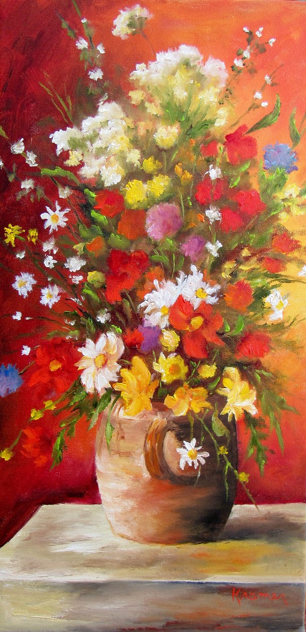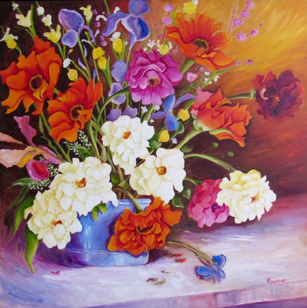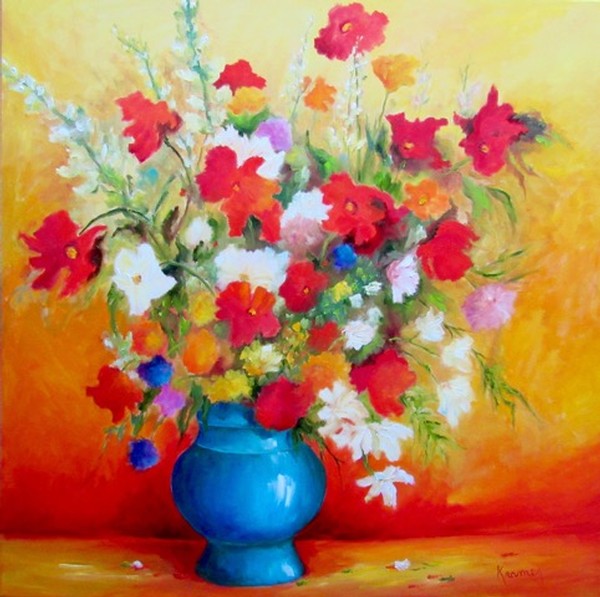 Mon style figuratif, à la limite de l’impressionnisme, s’affirme de plus en plus à mesure que je découvre et m’inspire des merveilleux paysages des Cantons de l’Est. Mon sujet préféré reste sans doute les fleurs, dans les champs, le jardin, en vase ou en pot.  Elles me permettent une grande liberté de création, autant dans la diversité de leurs formes que la variété de leurs coloris.