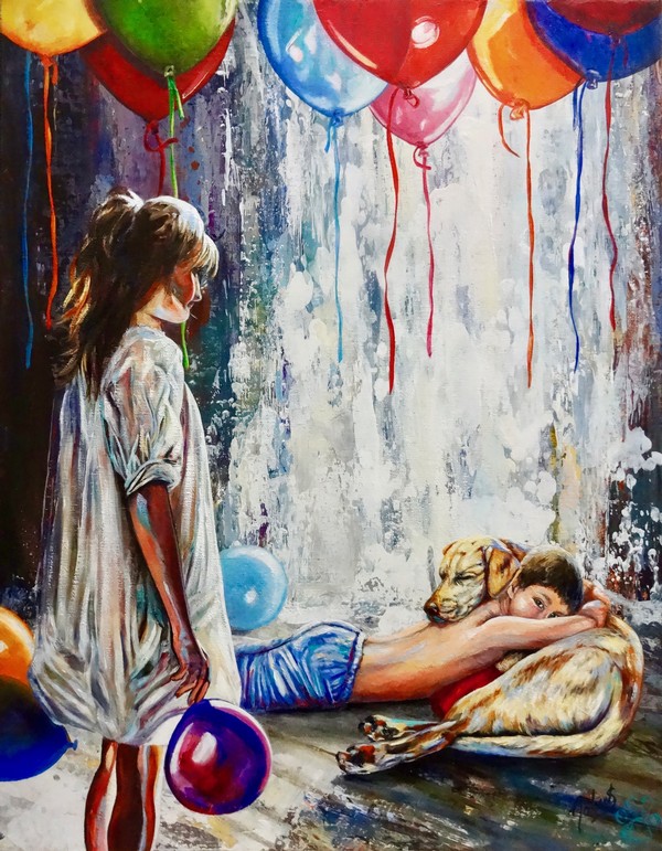 Sa nouvelle collection : « Prendre l’air » , veut rendre hommage à ce magnifique compagnon au cœur tendre pour sa grande intelligence et son dévouement ; également pour l’aidant naturel, l’ami très joueur, tantôt espiègle, qui partage toutes nos activités. Les gens ont un coup de cœur pour ses œuvres aux notes joyeuses, coquines, attendrissantes, qui font naître les sourires ! Décidément, ses toiles reflètent sa sensibilité, sa passion et la luminosité qui l’habite pour nous enchanter. Ce qu’elle désire le plus ? Chatouiller le cœur de chacun et transmettre une grande admiration pour le meilleur ami de l’homme dans chacune de ses œuvres ! Bienvenue dans ma « Niche »!!!
