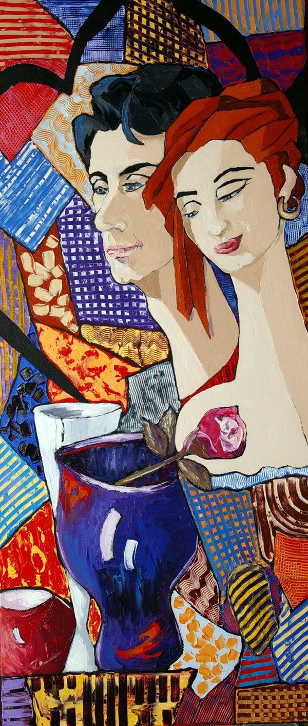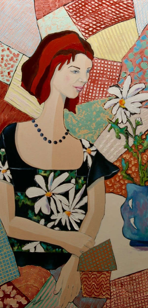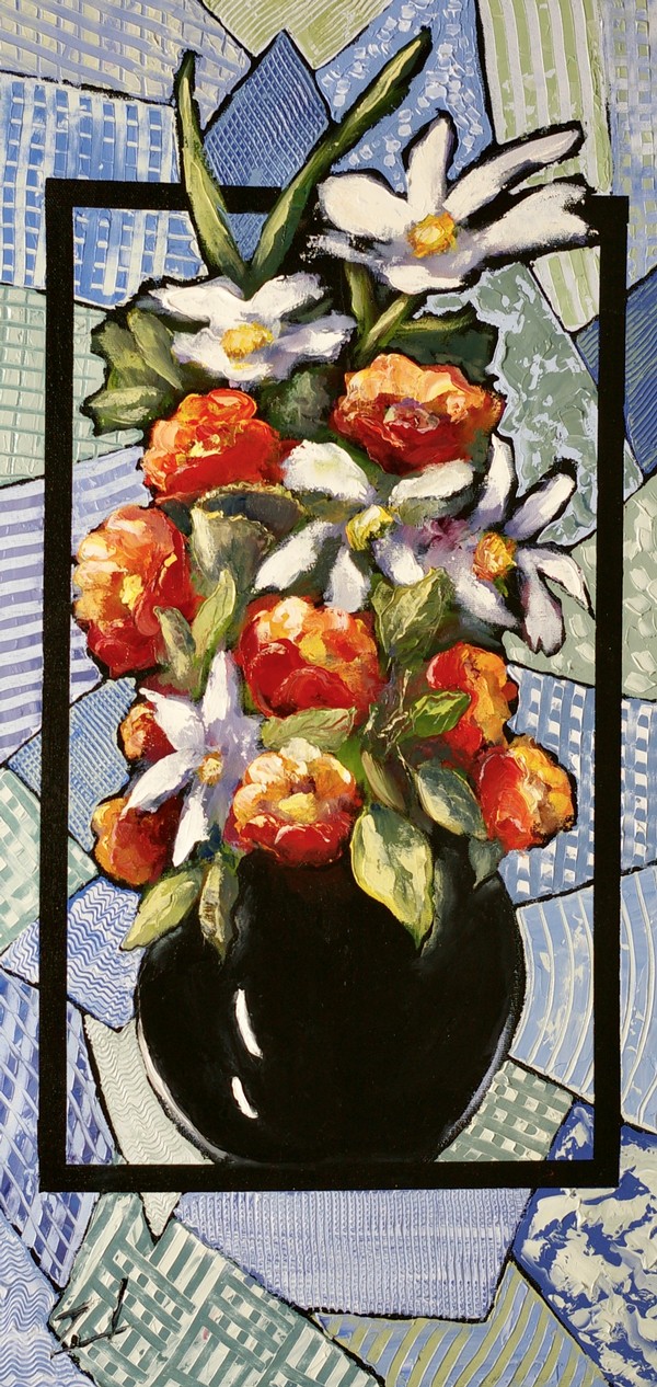 Dans ma peinture, on devine  mes explorations antérieures en fabrication de vitrail par le cloisonnement des couleurs des fonds.  La juxtaposition des couleurs et des textures procurent de la profondeur à mes compositions et le traitement de mes sujets ont une certaines filiation avec le mouvement expressionniste - fauviste.  Le lien entre le « patchwork » traditionnel et le traitement contemporain de mes sujets interpelle pour moi un amalgame temporel et identitaire.
