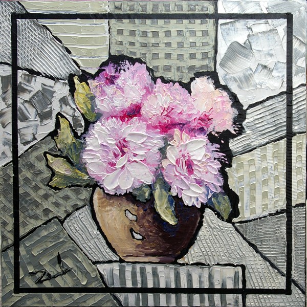Je joue aussi avec les contrastes entre les textures soutenues des fonds et les couleurs plus fondues des personnages;  entre les courbes et les lignes droites plus géométriques.  Les couleurs elles-mêmes ne sont pas en reste par un traitement très important dans l’élaboration du tableau. Je peins sur fonds noir et en conserve la trace dans mon tableau final afin d’accentuer encore plus les contrastes. Finalement, je crée différents plans au niveau de la perspective qu’il m’arrive de déconstruire au gré de ma fantaisie.  Le thème floral participe également au jeu des contrastes par l’apparente fragilité de leurs rondeurs et le caractère plus affirmé de leur environnement.