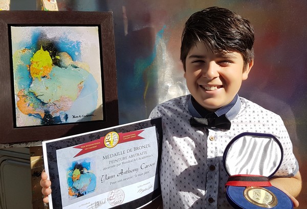 Quand je regarde avec attention un tableau de cet enfant de neuf ans, je découvre une peinture étonnamment mature. La curiosité et un sens de l’observation aigu se manifestent dans ses créations où l’abstraction lyrique cède le pas à des interprétations semi-figuratives à travers desquelles l’artiste nous présente sa vision du monde. Après avoir harmonisé ses couleurs et fait éclater les formes, il se concentre une fois encore sur son œuvre et se lance dans une chasse aux trésors Yann A Carsoncachés en esquissant des lignes théâtrales dramatiques pour révéler ses découvertes. L’abstraction ne lui suffit plus, elle ne le comble plus. Il continue à chercher et explore d’autres strates, il perce d’autres révélations mystérieuses. Il s’approprie un sujet, le voit apparaître dans un nouveau contexte pictural recréant un univers différent où l’aspect des formes le rassure, l’intéresse et l’amuse. Sa recherche donne un sens à sa compréhension du monde lorsqu’il concrétise une forme ou qu’il matérialise un objet figuratif.
