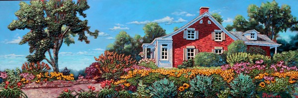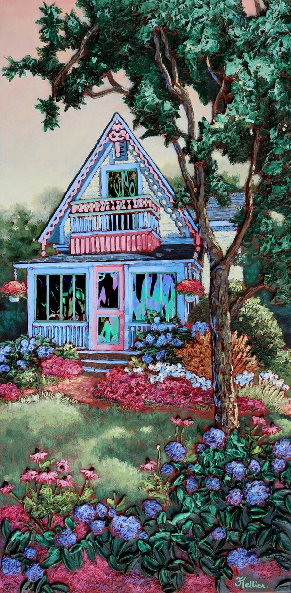 Chaque tableau devient un WOW! dans son exécution. Les couleurs et la lumière attirent l’enfant en moi un peu comme lorsque mon père nous emmenait en balade dans les rues à l’approche de Noël. Le mystère des couleurs  et de la lumière émanant des maisons explique sans doute mon attrait pour le patrimoine bâti. De plus, du fait que mon père avait fait une partie de ses études en architecture et  dessinait les plans de nos maisons, j’ai fait de même.  Je sais que j’ai réussi quand je vois les visiteurs afficher les mêmes yeux d’émerveillement devant mes tableaux avec vitrail. Ils font WOW! à leur tour et je vois l’enfant en eux. Cette nouvelle façon de mettre du vitrail dans mes œuvres en bas relief m’a d’ailleurs valu de nombreuses reconnaissances (dont plusieurs Coups de Cœur du Public) ainsi que faire partie de collections publiques et privées. Voir la réaction du public surpris et émerveillé ajoute à mon propre émerveillement de créer  avec les textures, les couleurs et m’emplit d’idées pour créer d’avantage.»